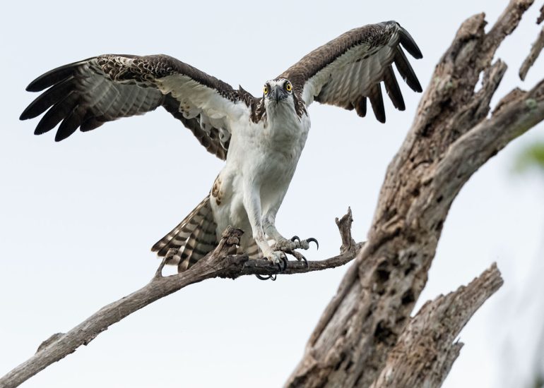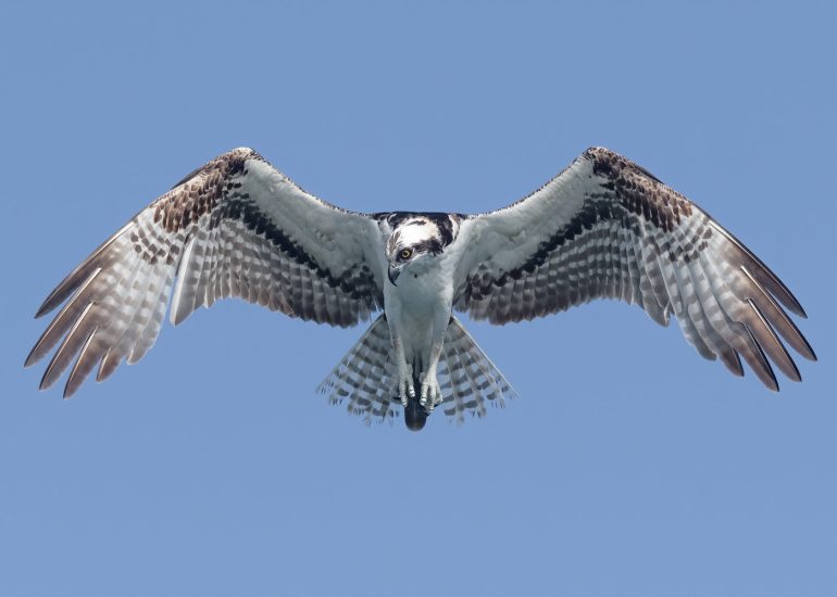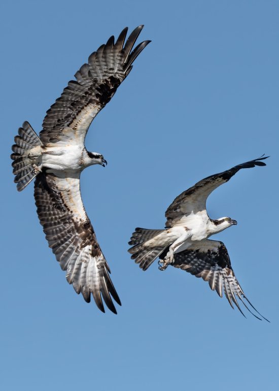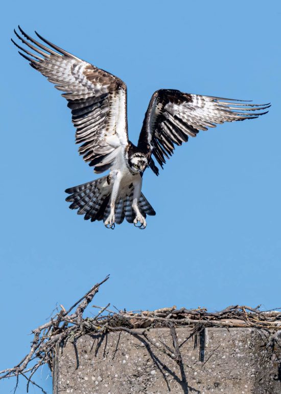 Really—and I mean really—good at flying and diving, Ospreys aren’t as flexible as other hawks which keeps them confined to fairly open areas. Their wingbeats are stiff and mimic a rowing motion when hovering waterways for food. Primarily singular birds, they usually perch alone or in small winter colonies of six to ten. Ospreys protect only the areas closest to their nest and in defense mode, they boldly chase other Ospreys that infringe upon their nesting territory.