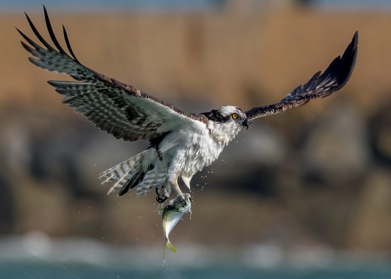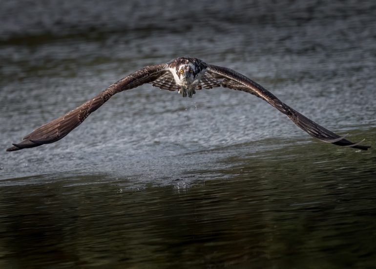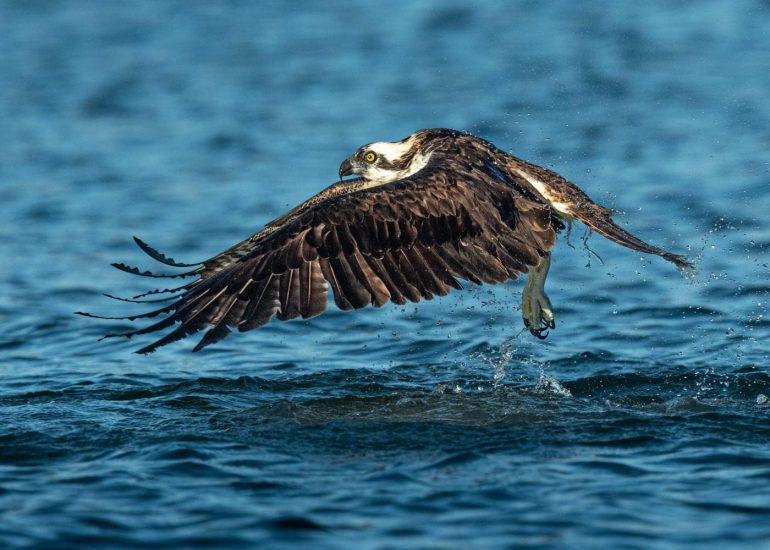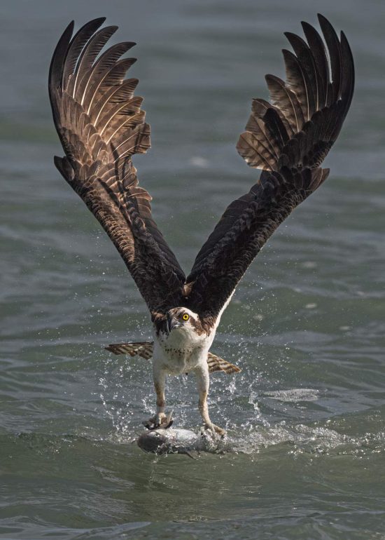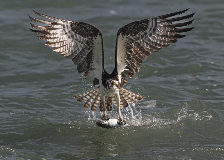 When foraging, these primal aviators glide slowly over shallow or fish-heavy waters, pausing for just a moment to hover when it sees fish below. Once it has an eye on the prize, Ospreys plummet nose first—but only for a second—before it takes the slightest turn upward, landing feet-first to easily grab its unsuspecting next meal using its dramatically curved talons.