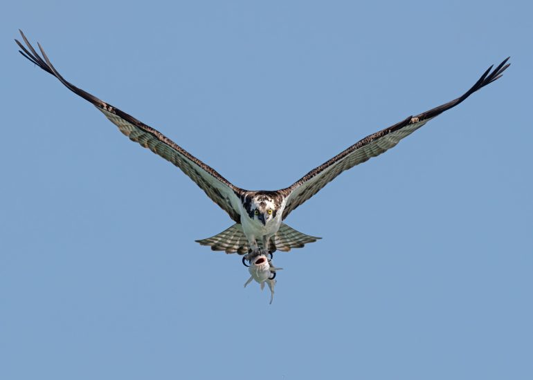 The fish most often caught by this unique raptor typically measure anywhere from six to 13 inches, weighing about half a pound. With that being said, there have been reports of Ospreys catching and eating fish weighing as much as two and a half pounds—that’s over half of their own bodyweight!