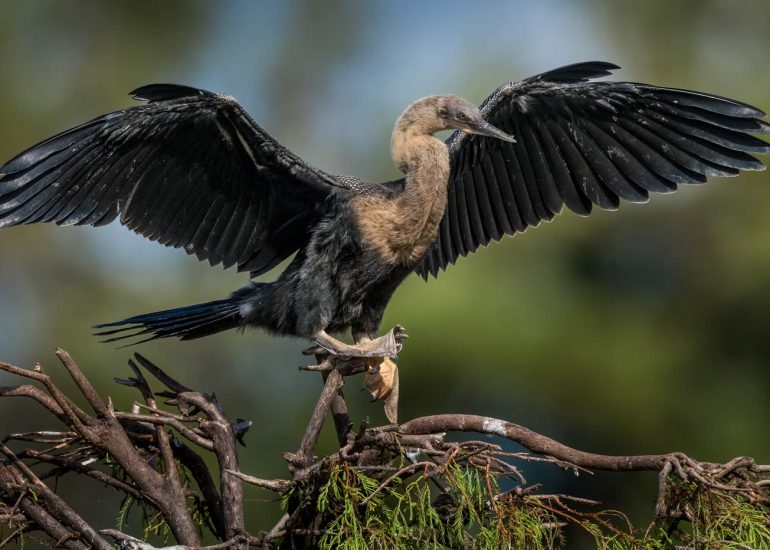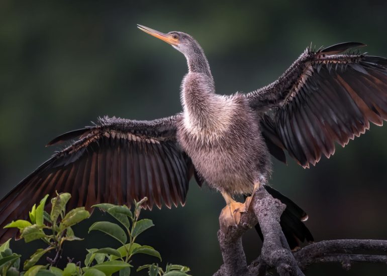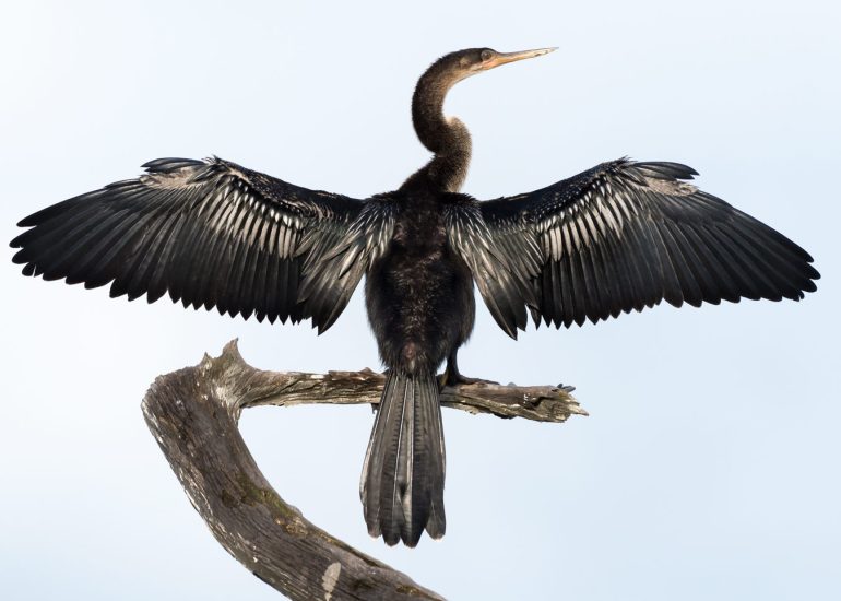 After every plunge into the water, the Anhinga strikes a triumphant pose on the fringes of shallow shores with its head held high and its shiny gray wings half expanded to dry and re-fluff its feathers. After that, it’s time to soar! Or go back into the water to find another snack…