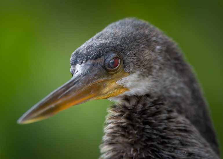 Like the Great Blue Heron and many other bird species, Anhingas are native to South Florida. Excellent swimmers and fliers, these big, lean-bodied, aquatic birds have lengthy fan-like tail feathers similar to a turkey. Their thin necks are long, S-shaped, and attached to a relatively long daggerlike beak with reddish eyes. They’re generally quiet, making clicking sounds that resemble a croaking frog only when around their nesting site.