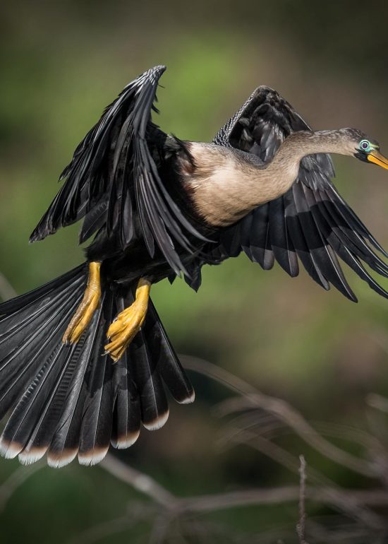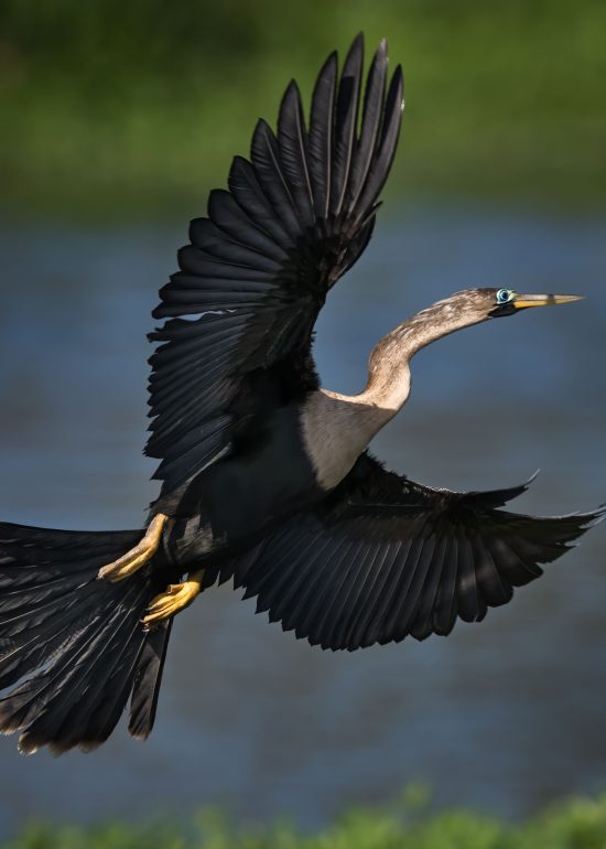 An Anhinga begins flight by diving from tree limbs or sprinting in shallow pools. While flying it holds its wings flat with its neck and tail sticking straight out, almost resembling a soaring cross. When swimming, they float like a wet blanket—wings fanned and a soggy turkey-like tail bobbing behind them out of the water. Their buoyancy varies so their heads and necks stick out above the water, which gives them the illusive appearance of a snake or as some say, the infamous Loch Ness Monster.