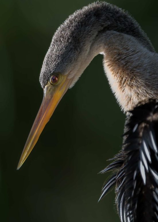Unlike most other waterbirds, Anhingas lack the preen oil glands that waterproof their feathers and so they must constantly dry themselves off. If not, I suspect they’d eventually become waterlogged and drown. So, while other aquatic birds such as ducks can easily dive under the water and return to the surface without a problem, the Anhinga cannot. This regal water turkey has to dry its plumage and regulate its body temperature after each dip, making catching prey on the first try all the more important. But, while it may seem counterproductive for their water-loving lifestyle, the Anhingas’ dense bone structure coupled with their wet feathers allows them to gently go under the water so they can covertly stalk fish with ease.