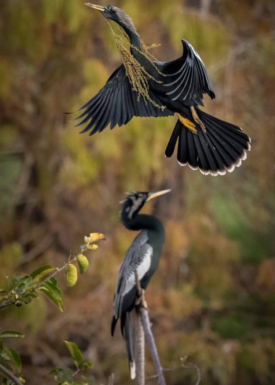Like Wood Storks, Anhingas are exceptionally territorial and will employ fierce and melodramatic displays of aggression when defending their home site. This includes fanning their wings wide to assert dominance and clacking their beaks. These displays have been known to lead to pecking fights, with each bird feverishly attacking the other’s crown and neck until one surrenders and leaves.