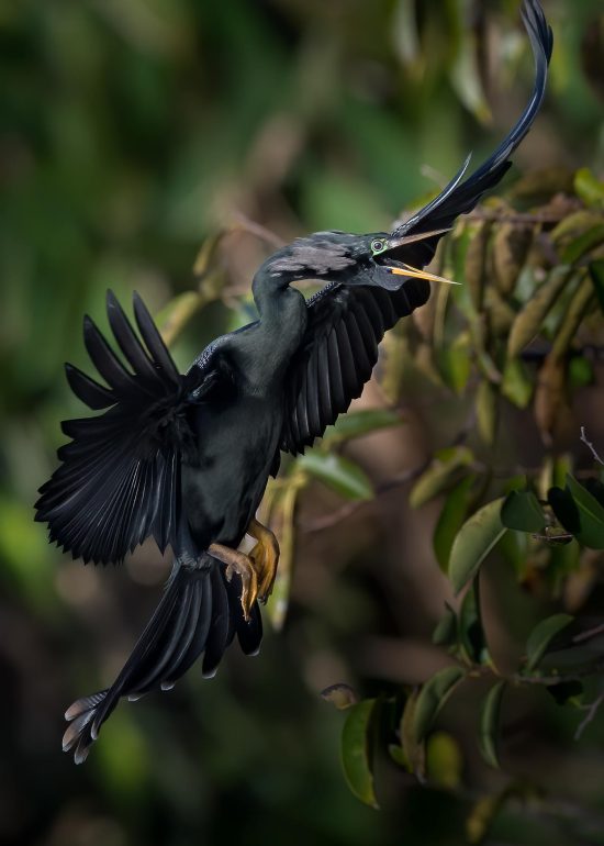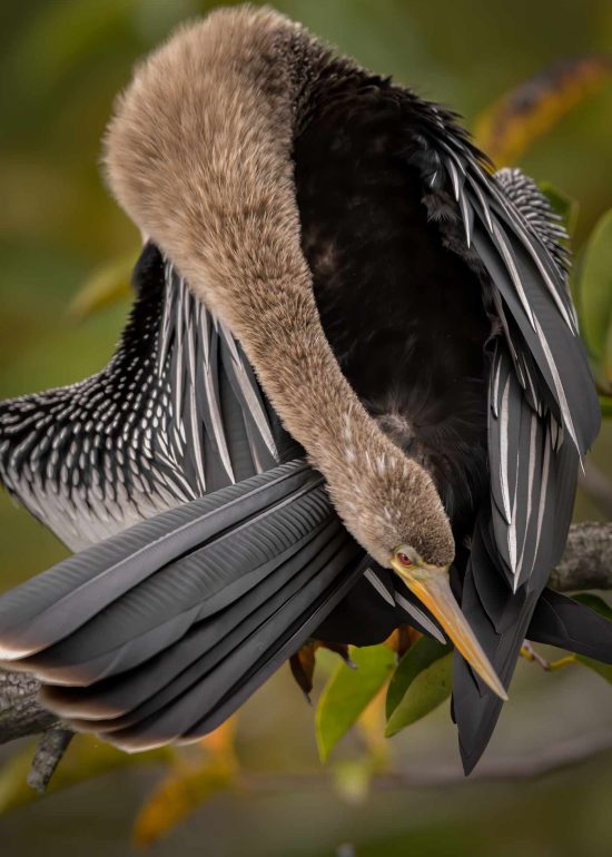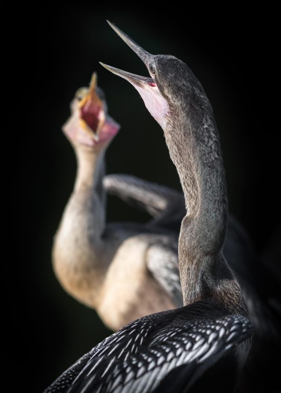 If you’ve ever visited the swamps, wetlands, or mangroves in and around the Florida Everglades, there’s a chance you’ve seen one of these stealthy, snake-like waterbirds gliding through shallow marshes. Known as the “snakebird”, the “water turkey”, the “darter”, and the “American darter”, the Anhinga (Anhinga anhinga) has rightfully earned each one of these titles. The ability to swim under water and rapidly spear fish with their sharp pointed bills are just a few of the unique characteristics that make Anhingas some of the most entertaining birds to photograph. I also find them to be quite interactive and chatty, never missing an opportunity to croak-up a conversation with me. It’s funny really; their interactions remind me of my cats—perhaps another reason I’m so fond of them.